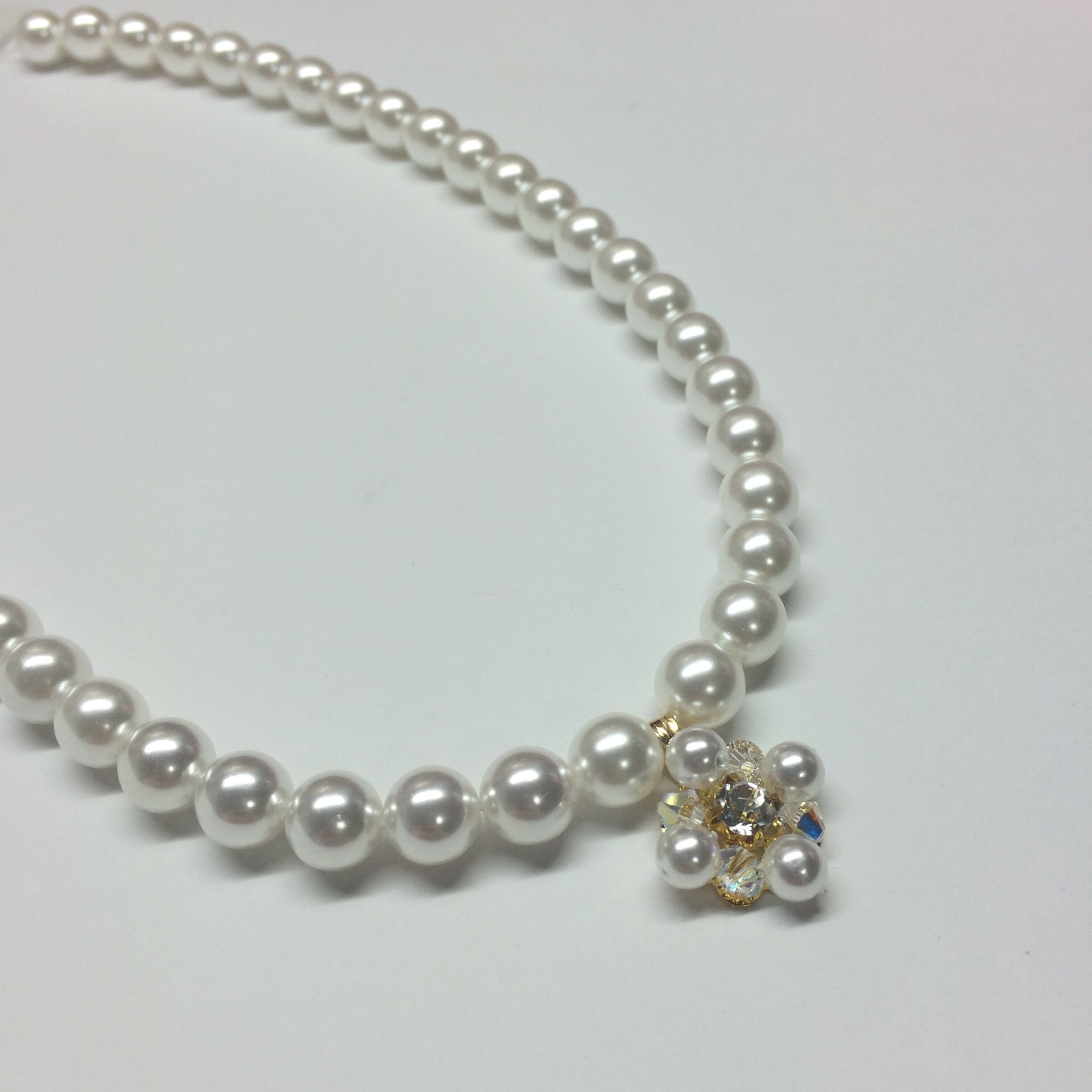 アクセントに、パール×ビジュー×スワロフスキーがキラキラ光る宝石箱のようなチャームを添えた、上品ながらも華やかな、ウェディングネックレスです♪