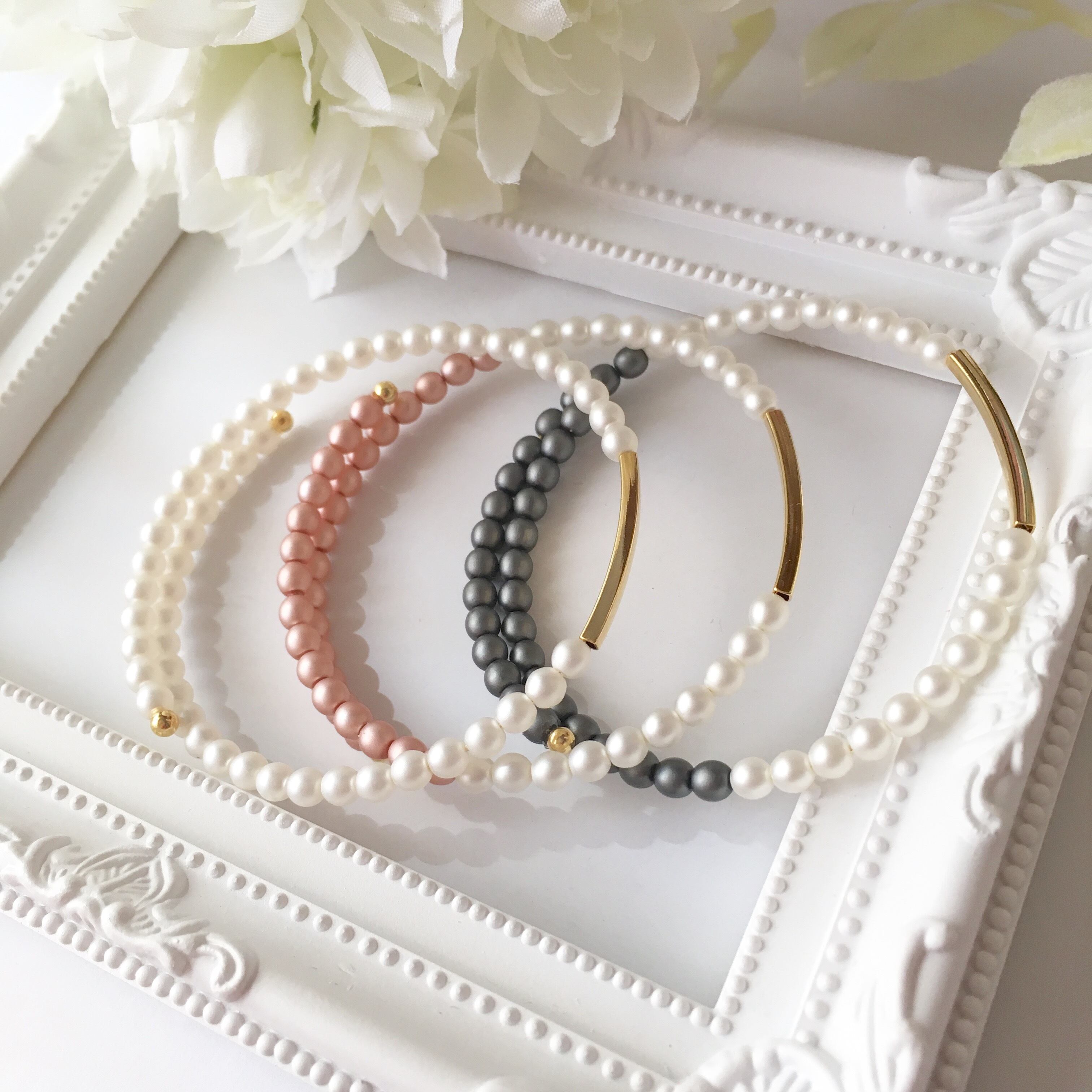 小さなつや消しパールと、ゴールドバーが組み合わさったシンプルながらも上品で可愛いバングルです♪